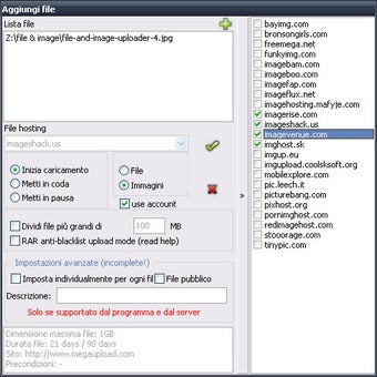 File & Image Uploader è un upload manager grazie a cui postare file e immagini su numerosi servizi online gratuiti e a pagamentoSe sei abituato a usare servizi come RapidShare, MegaUpload o ImageShack, saprai che la procedura d'invio via web spesso non è per nulla comoda. File & Image Uploader ti fornisce un'interfaccia rapida e ben strutturata per caricare file su più di centoquaranta siti di questo tipo.